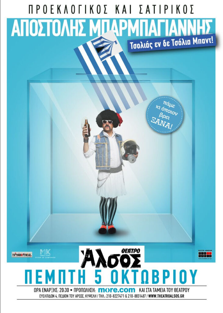 Ινκλούντινγκ: Ιντεράξιο με το κοινό, λάιβ φάρσες, σταυρωμένα ψηφοδέλτια, βάιραλ σκάνδαλα, απευθείας αναθέσεις, μπαλέτα, βύσματα, συνθήματα, μολότοφ και βίντεο (συμμετέχει ο δημοσιογράφος-ΜΑΤ: Μπαλούρδος).