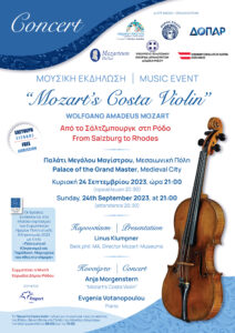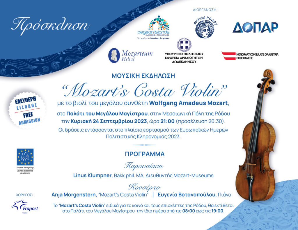 Το βιολί Costa του Βόλφγκανγκ Αμαντέους Μότσαρτ (Mozart΄s Costa Violin), από τα Μουσεία Μότσαρτ του Σάλτζμπουργκ, παρουσιάζεται δημόσια για πρώτη φορά στην Ελλάδα στο Παλάτι του Μεγάλου Μαγίστρου, στη Μεσαιωνική Πόλη της Ρόδου, την Κυριακή 24 Σεπτεμβρίου 2023. Η εκδήλωση αυτή κατέστη δυνατή χάρη στη συντονισμένη προσπάθεια του Επίτιμου Προξενείου της Αυστρίας στα Δωδεκάνησα και του Mozarteum Hellas, με το Υπουργείο Πολιτισμού-Εφορεία Αρχαιοτήτων Δωδεκανήσου, την Περιφέρεια Νοτίου Αιγαίου, τον Δήμο Ρόδου και τον ΔΟΠΑΡ, σε συνεργασία με το International Mozarteum Foundation της Αυστρίας.