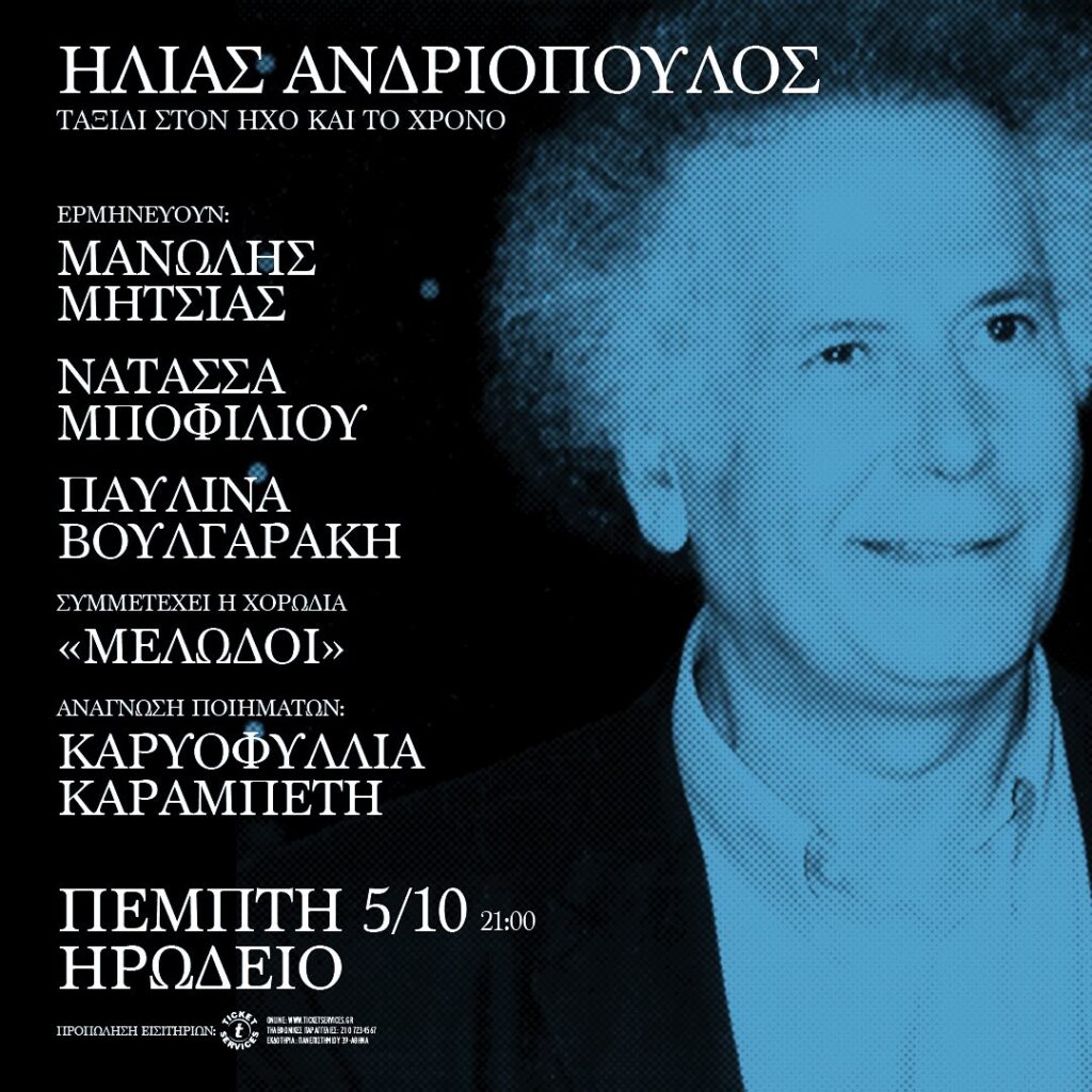 Ο Ηλίας Ανδριόπουλος ένας από τους σημαντικότερους συνθέτες του έντεχνου ελληνικού τραγουδιού, θα συναντήσει το κοινό που αγάπησε τα τραγούδια και την μουσική του και θα συνταξιδέψει μαζί του σε μια μοναδική συναυλία με τίτλο: