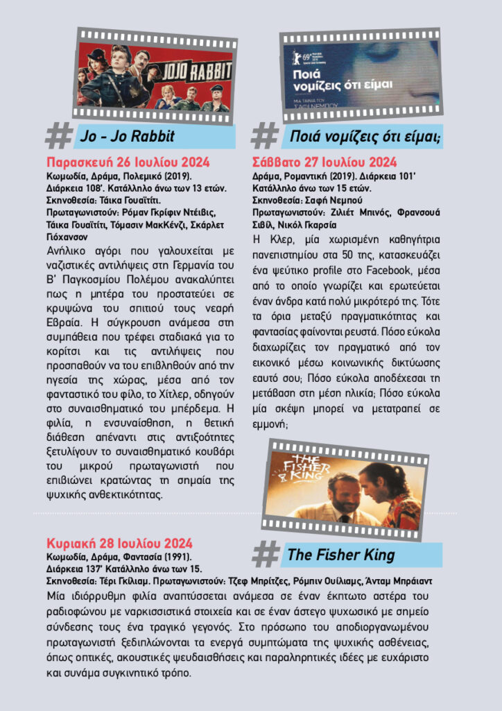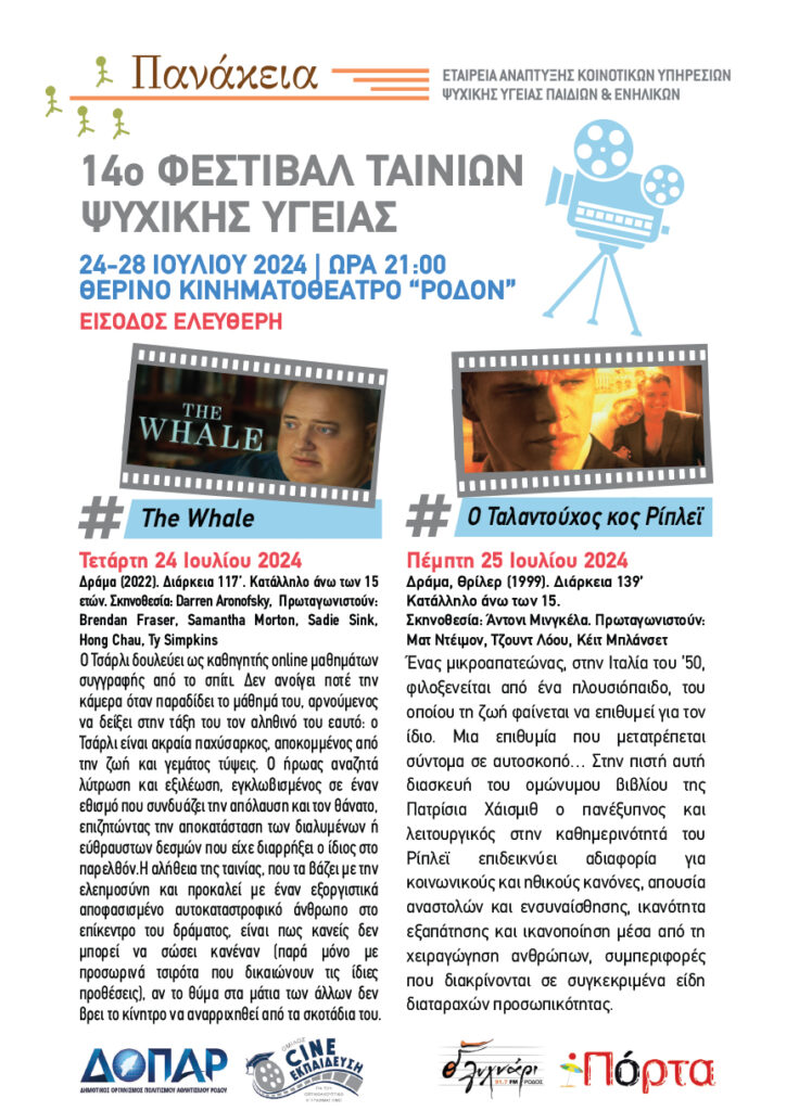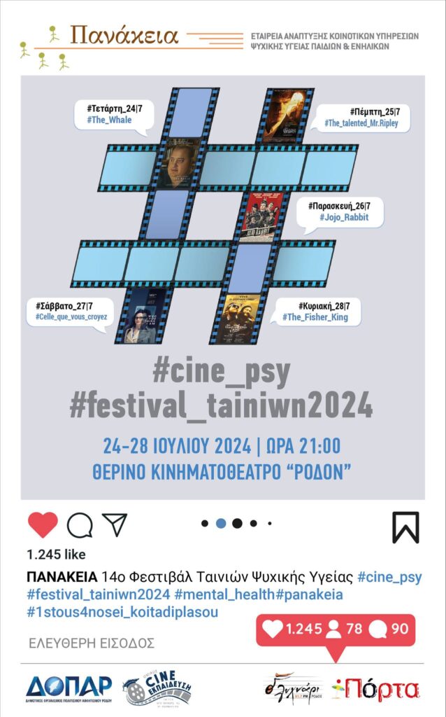 H Εταιρεία Ανάπτυξης Κοινοτικών Υπηρεσιών Ψυχικής Υγείας Παιδιών και Ενηλίκων «Πανάκεια» διοργανώνει το 14ο Φεστιβάλ Ταινιών Ψυχικής Υγείας από τις 24 έως και τις 28 Ιουλίου 2024 στο Θερινό Κινηματοθέατρο Ρόδον, με στόχο την ευαισθητοποίηση και ενημέρωση της κοινότητας σε θέματα ψυχικής υγείας.