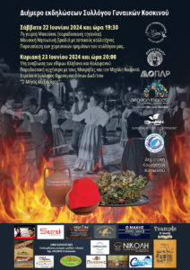 Ο Σύλλογος Γυναικών Κοσκινού διοργανώνει εκδηλώσεων. Το Σάββατο 22 Ιουνίου 2024 και ώρα 19.30 στην κεντρική πλατεία Κοσκινού θα πραγματοποιηθεί η 7η γιορτή Μακούκκι (παραδοσιακή…