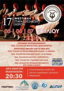 Το Πρόγραμμα του 17 Φεστιβάλ Παραδοσιακών χορών στις 5 , 6 και 7 Ιουλίου στην ΚρεμαστήΠαρασκευή 5 Ιούλιου1 Πολιτιστικος συλλογος (ΠΡΌΟΔΟΣ )Τμήμα παιδικό Α2 Σύλλογος…