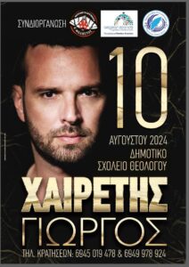 Πολιτιστικός Σύλλογος Θεολόγου “Ο Μόδεστος” Γιώργος Χαιρέτης Σάββατο 10 Αυγούστου Δημοτικό σχολείο Θεολόγου Συνδιοργάνωση με Περιφέρεια Νοτίου Αιγαίου & Ομοσπονδία Πολιτιστικών Συλλόγων Τηλ. Κρατήσεων: 6945019478…